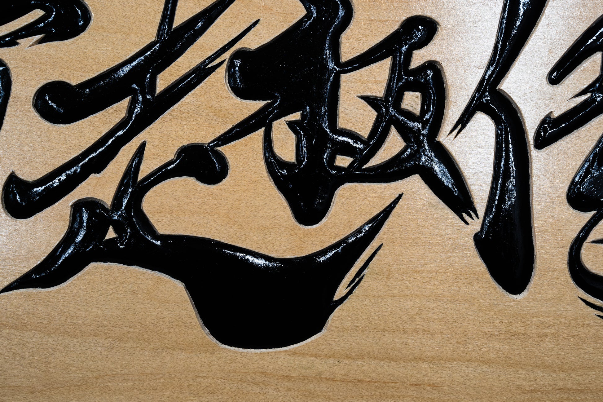 The bold calligraphy, created by Masashi Yamana, the artist behind the movie “Bakkon” title logo, has been intricately carved by Genuemon using the kamaboko-bori (semi-rounded relief carving) technique. The surface is finished with three layers of water-based black urushi lacquer, achieving a deep luster that changes with the light.